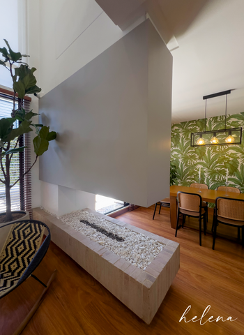 El ingreso es protagonizado por las escaleras de madera y hierro, que conecta el estudio con la zona social, esta ultima posee un ventanal de piso a techo en doble altura que brinda iluminación natural a todo el espacio. La chimenea se encarga de integrar el salón con el comedor, este ultimo con salida al jardín posterior. Al subir una claraboya redonda decora el techo de las escaleras y conecta un hall y sala de TV, que distribuyen a su vez a la zona privada, cada habitación fue minuciosamente pensada y ofrecen una vista y ventilación ideal.